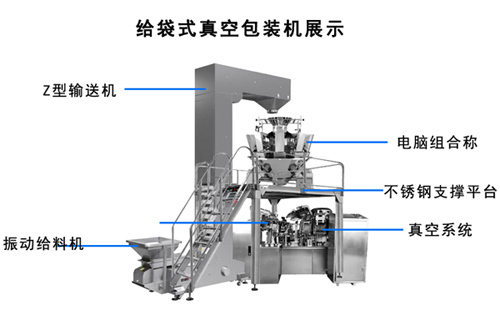 全自动给袋式真空包装机和全自动给袋包装机都是由旋转给袋系统和封口系统两大部分组成,均具有上袋系统,计量系统,投料充填系统,封口系统,所以对于设备的主要零部件都是一样的,气动原件均采用进口配置,只是全自动给袋式包装机不具有抽真空功能,所以全自动给袋包装机不配备真空泵,而全自动给袋式真空包装机配有德国原装进口2台真空泵,分别用于一次粗抽和二次精抽真空泵。